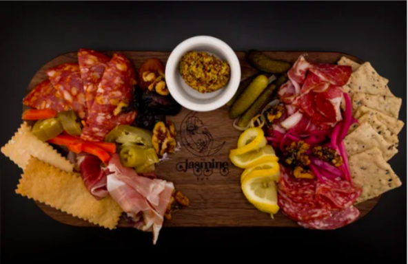 Savor a thoughtfully curated assortment of premium cured meats, each selected for its unique flavor profile and artisanal quality. Accompanied by a selection of mustards, pickles, and freshly baked bread.